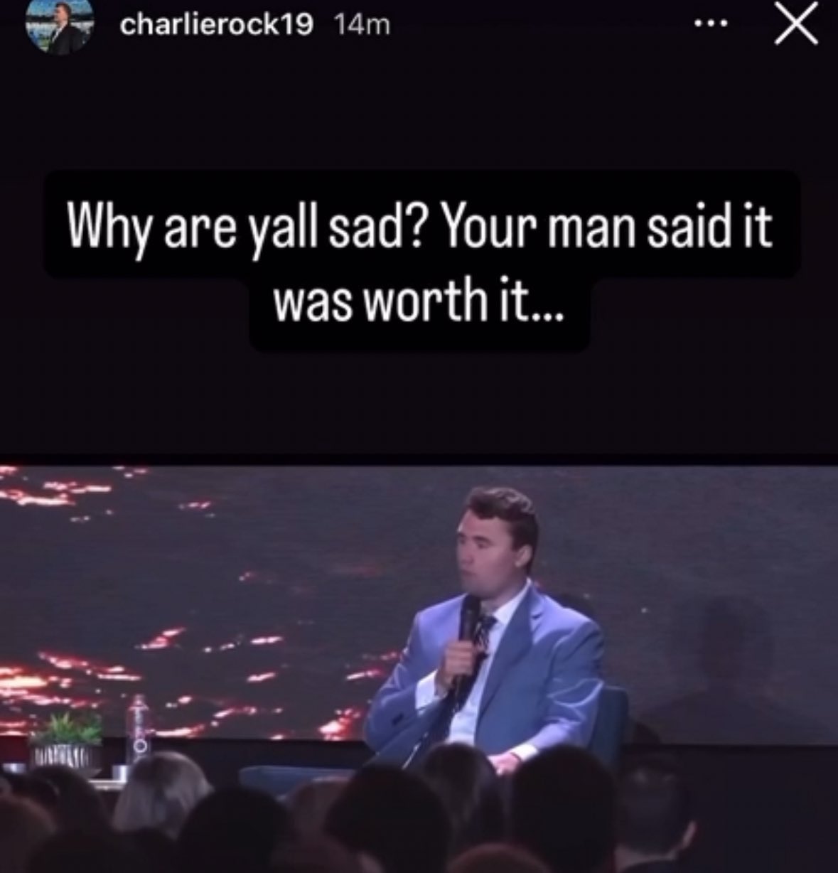 Social media posts circulating online showed screenshots from Rock's Instagram account (which is now inactive), on which he posted a video of Kirk at a speaking event with the caption, "Why are yall sad? Your man said it was worth it …" referring to Kirk's death.