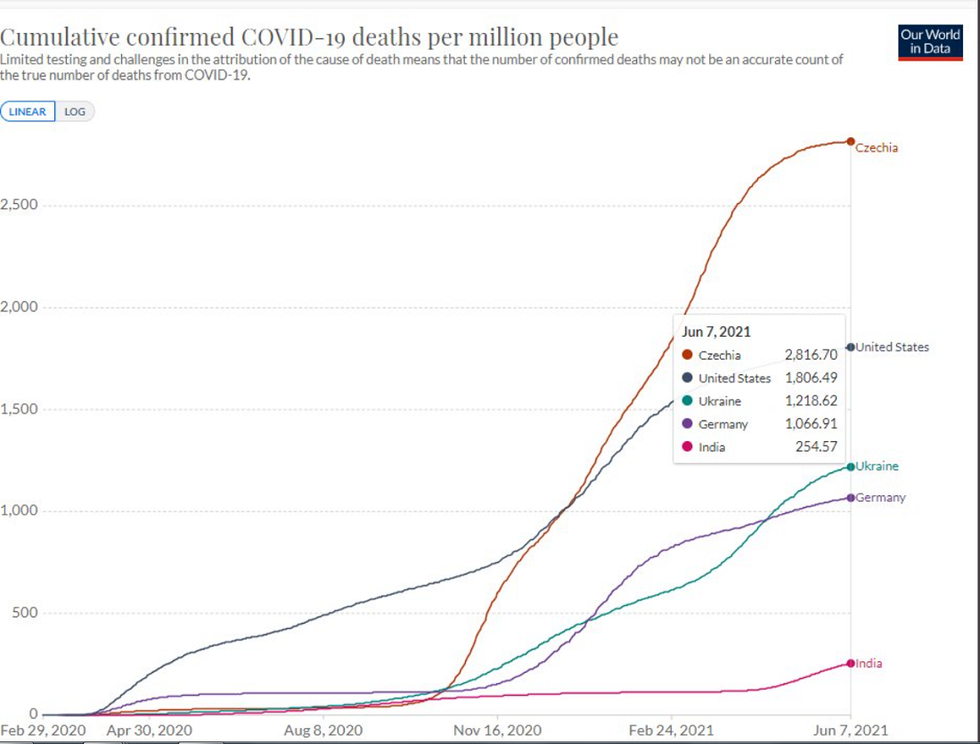 Despite Fauci warning about the Indian "Delta" variant being more deadly and continuing to push vaccines as the only solution, in reality, India's death rate from COVID — even after achieving what appears to be herd immunity — is just one-seventh of our COVID death rate and that of other European countries! India's death rate is even lower than Israel's and fairly close to that of Finland, which largely escaped the worst of the virus so far.
