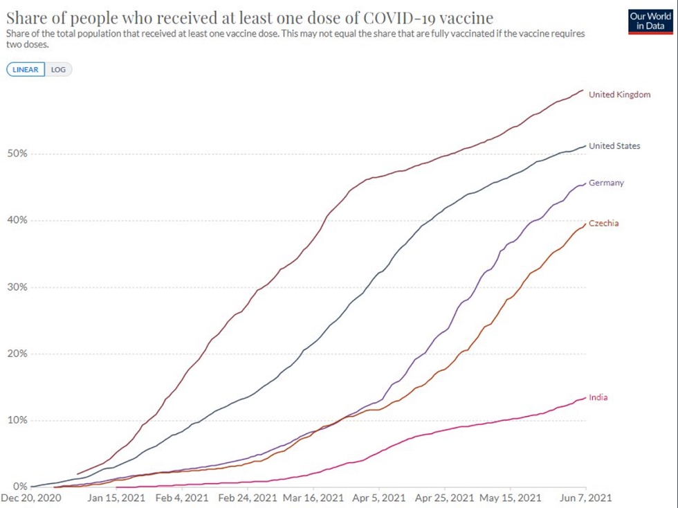 And no, the secret sauce is not the vaccine, because fewer than 15% of Indians have received at least one dose, while over 50% of Americans and 60% of British citizens have already had one shot.