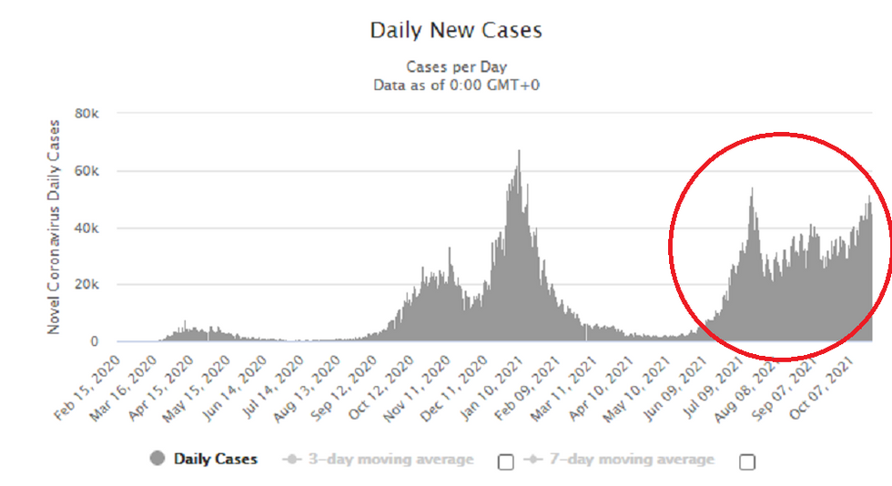 According to PHE data, 86% of all U.K. residents over age 12 have received at least one shot, including nearly everyone in a vulnerable age bracket. Yet the summer and early fall curve, as presented by Worldometer, has blown out the magnitude of the case curve last year when nobody was vaccinated, and the daily numbers are reaching close to their winter peak.