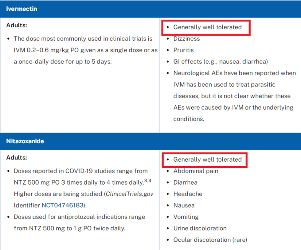 Remember, the original chart was updated on July 8, 2021, well into the pandemic. Nothing has changed since July other than ivermectin becoming mainstream in public knowledge. The approval status was the same then as it is now, and there is zero evidence of more side effects. In fact, millions of doses have been administered without incident, and certainly much more safely than remdesivir. Even if one were to suggest that the NIH is dinging ivermectin based on its own lies and rumors about people getting sick from overdosing on the horse paste (because government has made it hard to get the human pills), how could officials possibly take the distinction away from nitazoxanide? It’s too rare and expensive for people to use, and there is little evidence people used it, much less had adverse reactions to this very safe drug.