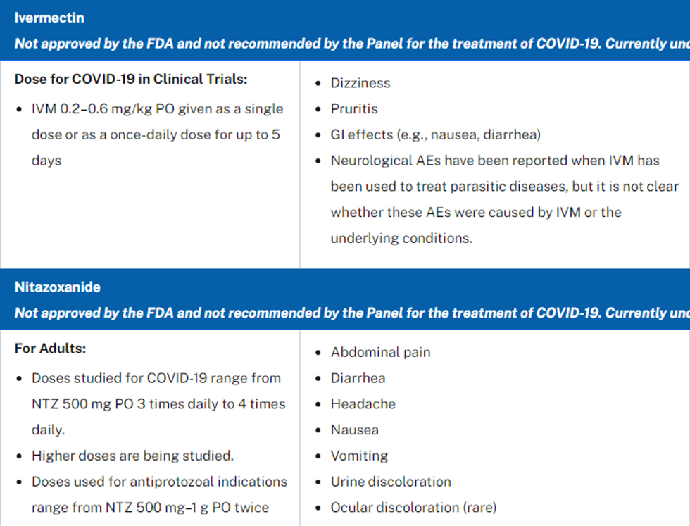 In October, I referred people to the NIH’s chart 2E, which placed ivermectin and nitazoxanide on the same footing as remdesivir in potential antiviral agents against COVID. At the time, I noted that while the NIH admitted in the chart that remdesivir (a big money-maker for hospitals) has the potential to cause kidney failure and liver toxicity, ivermectin and nitazoxanide were given the distinction of “generally well tolerated,” which is a term used to describe a near-perfect drug. I warned people to screenshot it (available on the Wayback Machine), lest the NIH remove or modify the page.