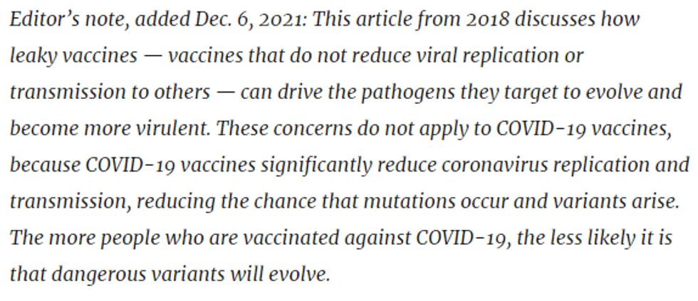 Yet now that we are seeing such a microbiological Frankenstein play out in real life and people like Dr. Robert Malone have been citing this article to raise red flags about the leaky COVID shots, Quanta magazine took the unprecedented step of slapping an editor’s note on an article three and a half years later to get people to stop applying it to the leakiest vaccine of all time.