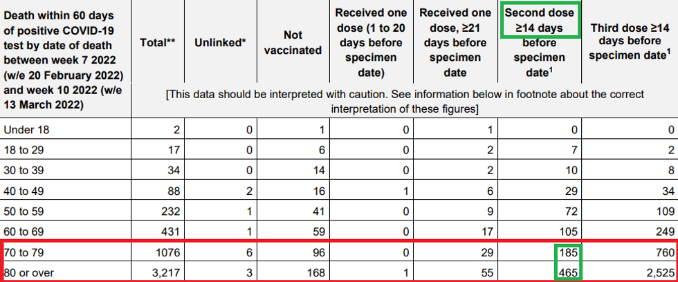 According to the latest U.K. health surveillance report, roughly 95% of those over 70 are double-vaccinated and about 90%-93% of the age cohorts over 70 are boosted. Just 1.6% of the senior cases between weeks 7 and 10 of this year were among the unvaccinated, which is below the 5% share of the population pie they compose. The triple-boosted are 90% of the cases.