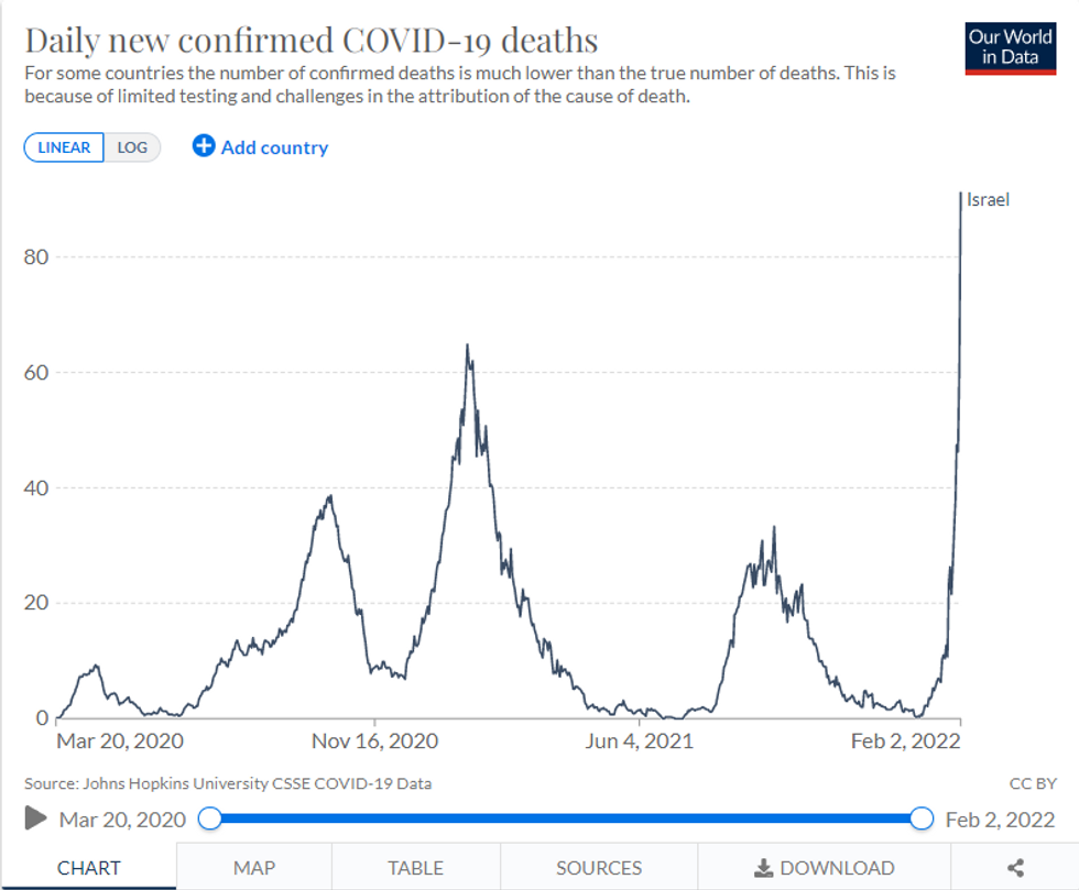 Covid deaths per capita in Israel are now twice the peak of the rate seen in South Africa.\n\nWhich is unprecedented.\n\nWhy is the relative performance deteriorating so much?pic.twitter.com/HMjNt8azjw— Covid19Crusher (@Covid19Crusher) 1643525747