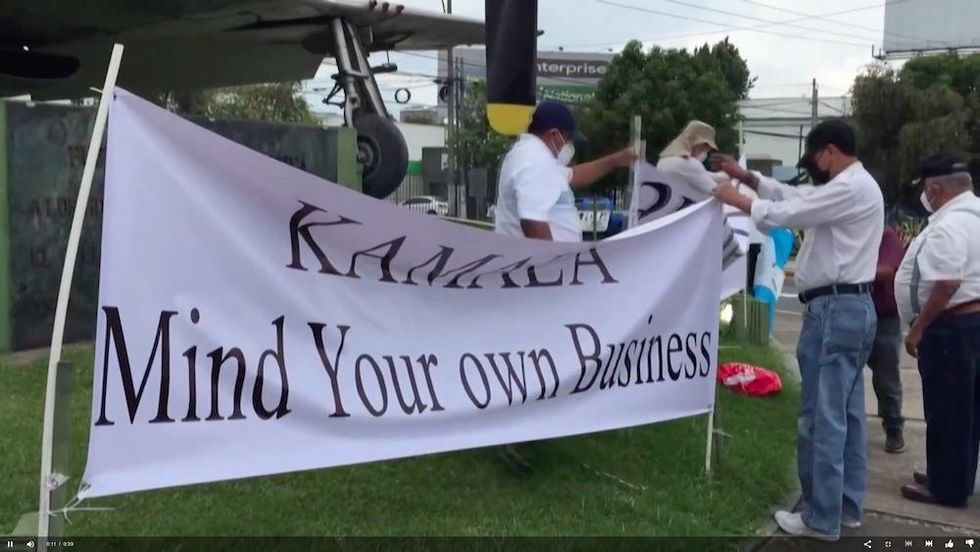Signs meant to send a message to Harris said "Kamala, Go Home" and "Kamala, Mind Your own Business" were highly visible along her route to meet with Giammattei.