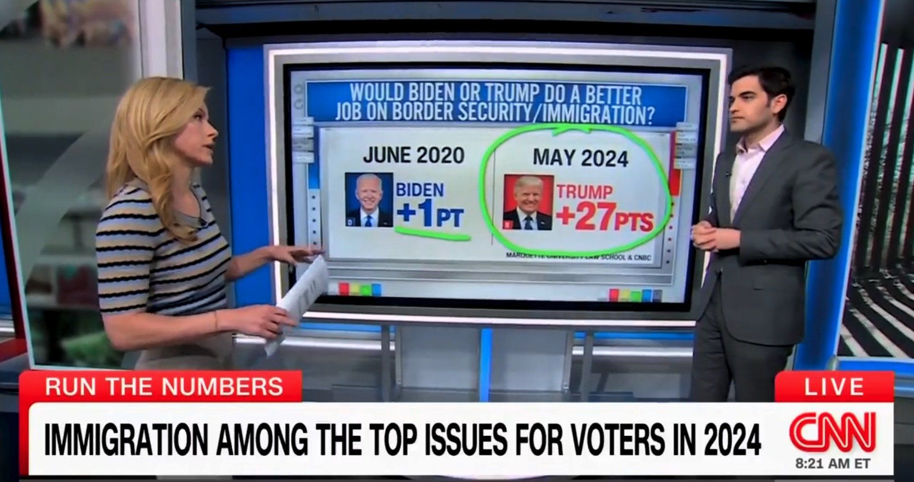 "Back in June 2020, Biden was actually trusted more on the question of border security and immigration by a single point," Enten said. "Look at where we are in May of 2024. My goodness gracious. Look at this huge jump that Donald Trump has gotten. He is now ahead on this issue by 27 percentage points."