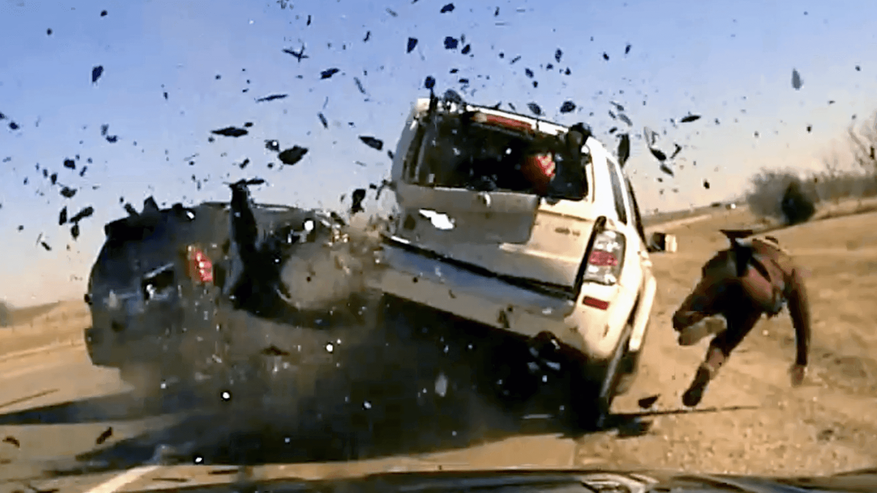 Suddenly, out of nowhere, a black SUV zooming down the highway violently slammed into the car. Debris from the forceful collision flew into the air, and the trooper was launched into the grass from the impact of the car crash. Despite being involved in the brutal collision, Gregory was able to jump to his feet and can be seen in the dashcam video running out of frame.