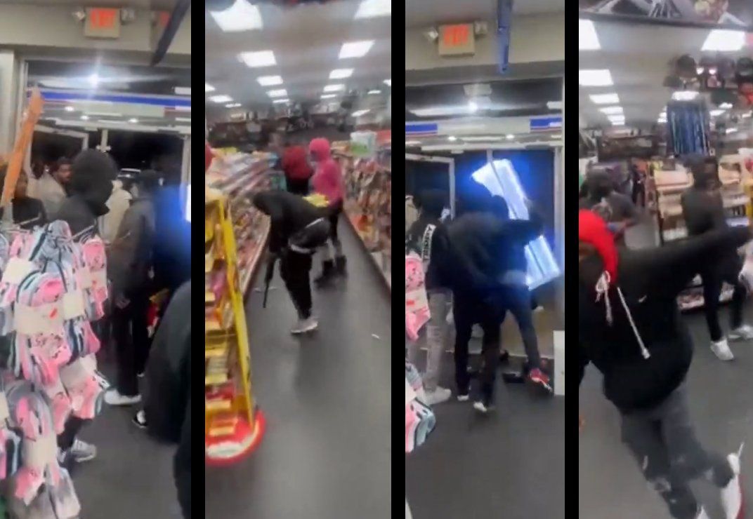 Footage of one of the incidents shows a mob of looters, some masked and others bare-faced, ransacking a gas station and absconding with everything from candy to an electric sign. One hooded figure taking his time deciding which chocolate bars to load into his sagging pants can be seen carrying around a rifle. Another masked figure grabbing a handful of loot appears to be an adolescent girl.