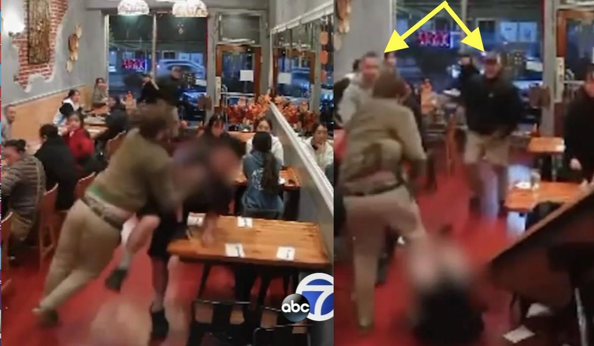 The clip shows two men who were dining at separate tables inside the restaurant getting up from their seats and grabbing and restraining the attacker.