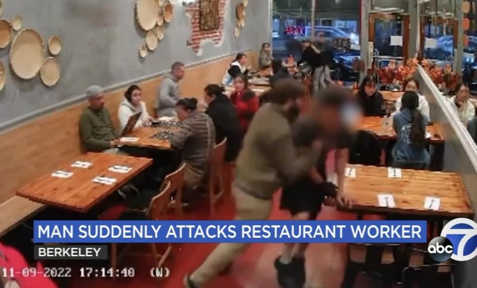 Surveillance video inside a Thai restaurant in Berkeley, California — the owner asked KGO-TV to not name it — shows a man at the bottom of the screen who had asked for free food around 5:15 p.m. Wednesday.