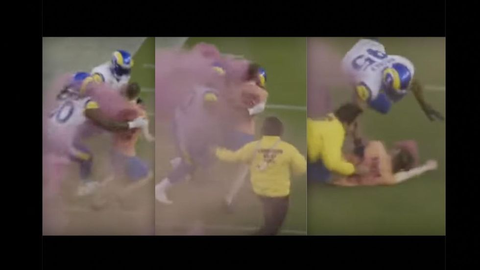 Los Angeles Rams linebacker Bobby Wagner absolutely leveled an animal-rights activist who made the mistake of running onto the playing field during Monday night's football game against the San Francisco 49ers — and getting a tad too close to the Rams' sideline.