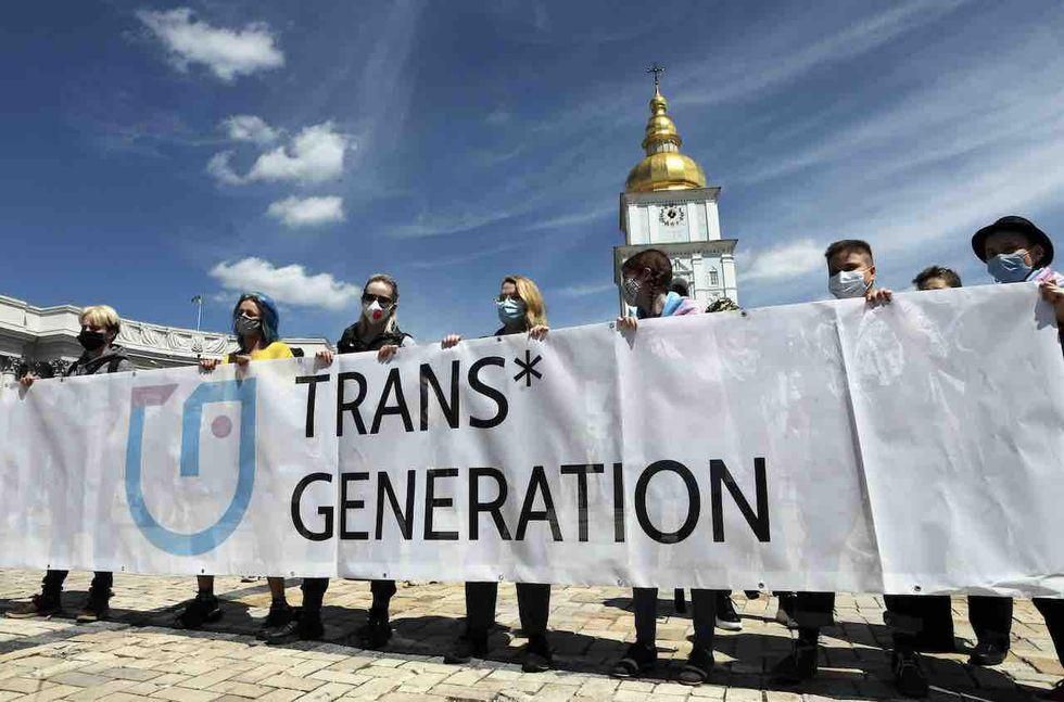 Demonstrators rally in Mykhailivska Square, Kyiv, capital of Ukraine, during Trans*March 2021 pro-transgender procession. Yuliia Ovsiannikova/Ukrinform/Barcroft Media via Getty Images