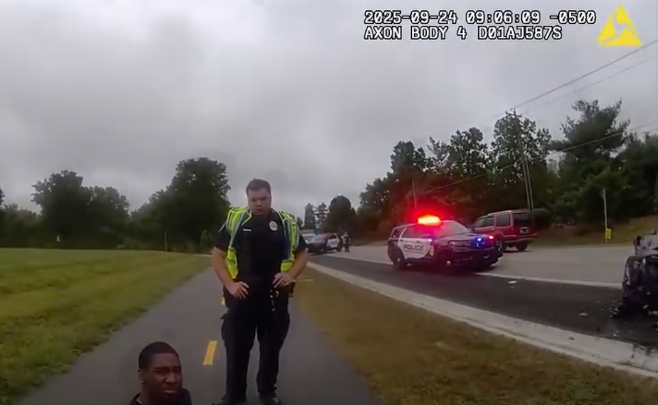 The entire exchange is noticeably calm and cordial, even when the officer handcuffs the motorist.