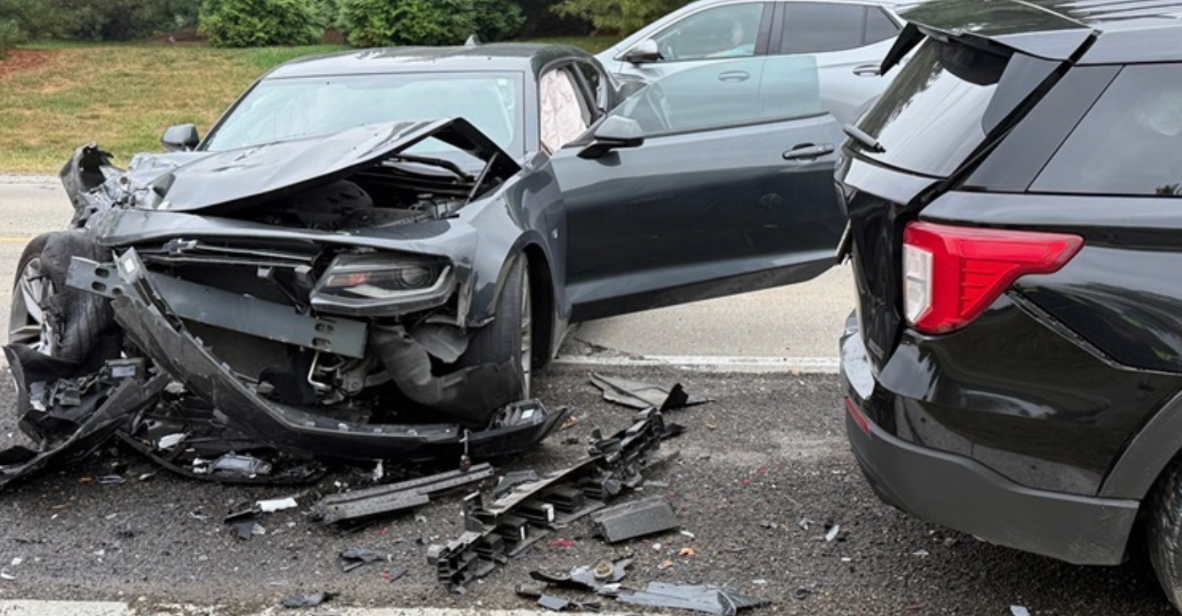 The officer began walking up to the pulled-over vehicle from the passenger side when a gray 2018 Chevrolet Camaro slammed into his squad car from behind, police said.
