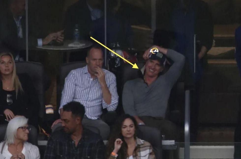 Gov. Newsom is sitting on the right with the face mask dangling from his ear. (Image source: LA Rams "fan cam" screenshot)