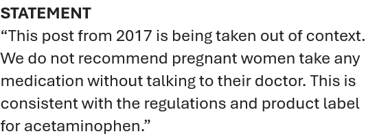 "We do not recommend pregnant women take any medication without talking to their doctor," continued the statement. "This is consistent with the regulations and product label for acetaminophen."