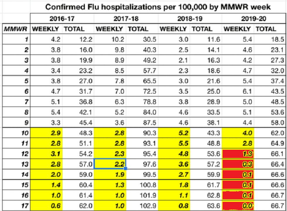 After compiling the CDC's data on weekly influenza hospitalizations per 100,000 for the three prior flu seasons, Kyle contrasted those numbers to the weekly trend line in the 2019-2020 season. The numbers are astonishing: