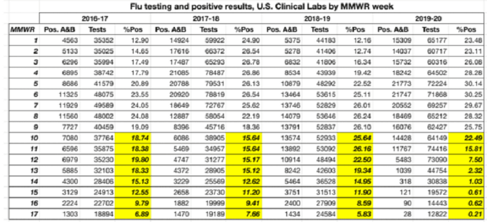 Flu Testing, 2020 Week 40 vs. 2019 Week 40Clinical labs:2020: 17 positives on 7,923 tests (0.21%)2019: 447 posi… https://t.co/A6nD0aMJo8— Phil Kerpen (@Phil Kerpen)1602729931.0