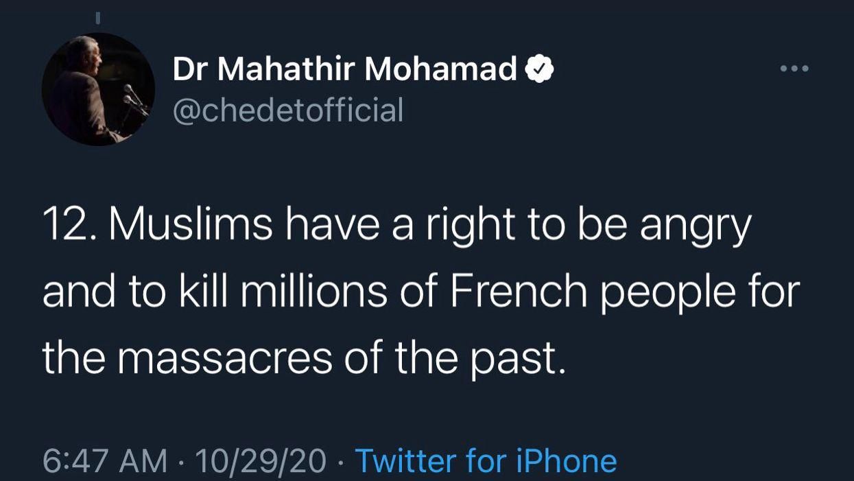 The deleted tweet was part of a longer thread from former Malaysian Prime Minister Dr. Mahathir Mohamad, who said that while he personally does not approve of the murder, Muslims have a "right to be angry" with Western civilization and French President Emmanuel Macron over the display of cartoons depicting the prophet Mohammad.