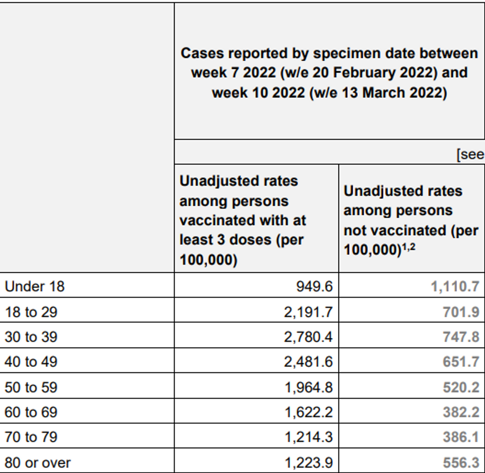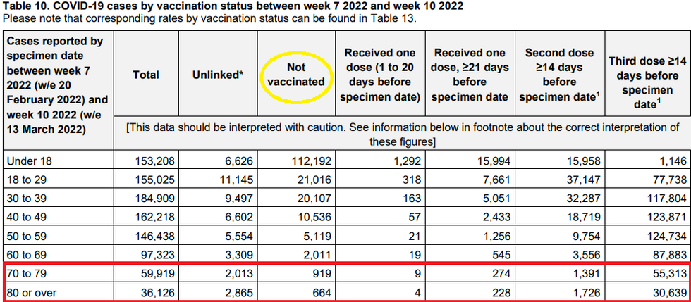 According to the latest U.K. health surveillance report, roughly 95% of those over 70 are double-vaccinated and about 90%-93% of the age cohorts over 70 are boosted. Just 1.6% of the senior cases between weeks 7 and 10 of this year were among the unvaccinated, which is below the 5% share of the population pie they compose. The triple-boosted are 90% of the cases.
