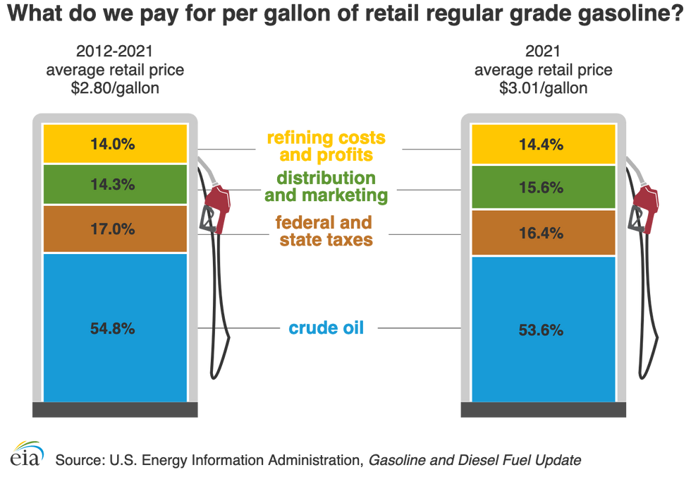 State and federal gas taxes make up about 16.4% of the average retail price for a gallon of gasoline, according to the U.S. Energy Information Administration.