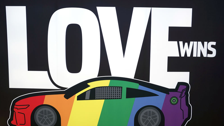 PORTLAND, OREGON - JUNE 03: A detail view of a 'NASCAR "LOVE WINS' Pride button during qualifying for the NASCAR Xfinity Series Pacific Office Automation 147 at Portland International Raceway on June 3, 2023, in Portland, Oregon. (Photo by James Gilbert/Getty Images)