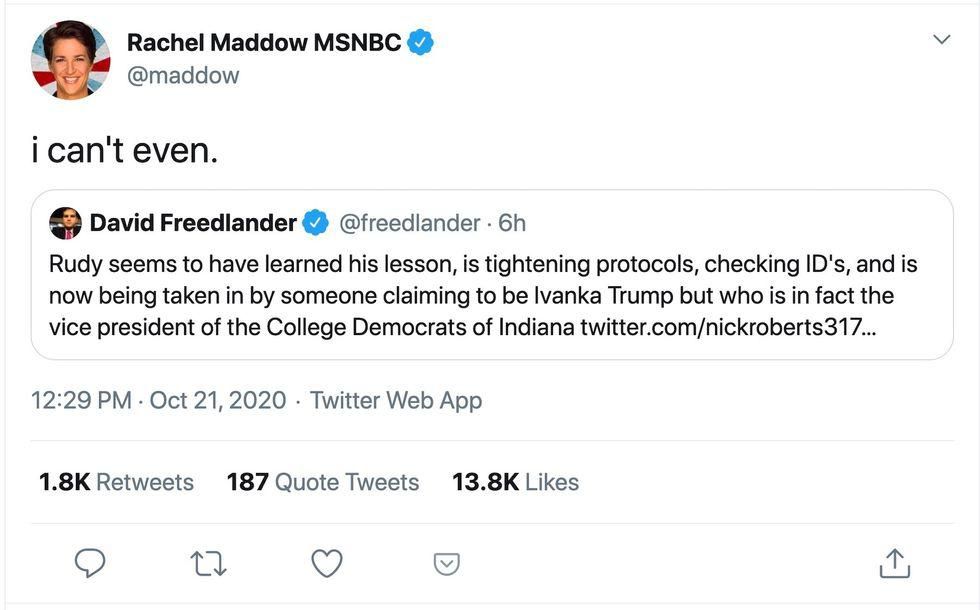 "Rudy seems to have learned his lesson, is tightening protocols, checking ID's, and is now being taken in by someone claiming to be Ivanka Trump but who is in fact the vice president of the College Democrats of Indiana.