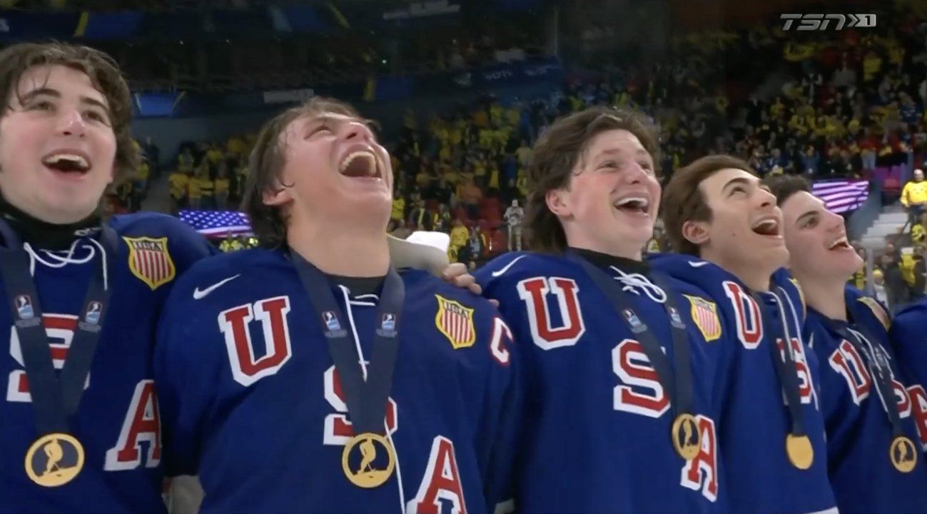 Team USA junior hockey players capture hearts with patriotic singing of national anthem after winning world championship