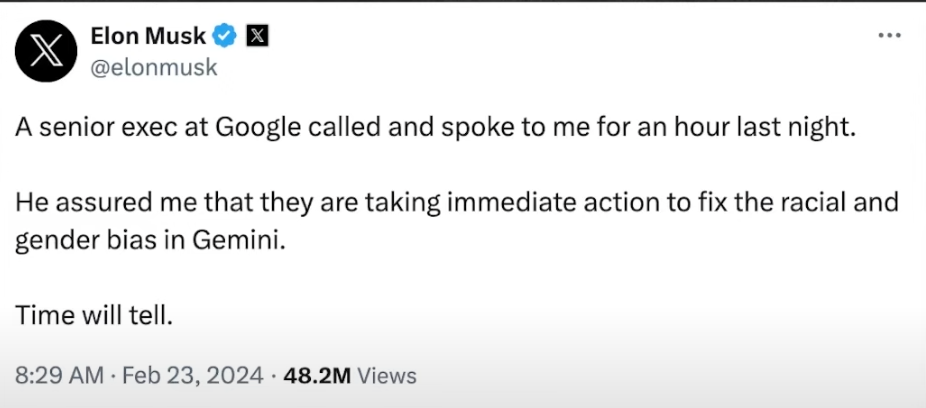 Elon Musk addressed the Gemini scandal as well. On February 23, he tweeted: