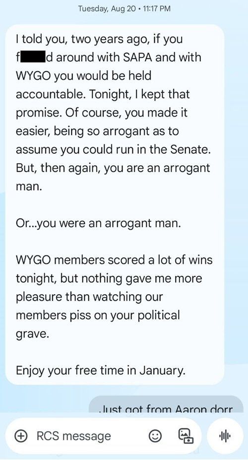 "WYGO members scored a lot of wins tonight, but nothing gave me more pleasure than watching our members piss on your political grave," he added. "Enjoy your free time in January."