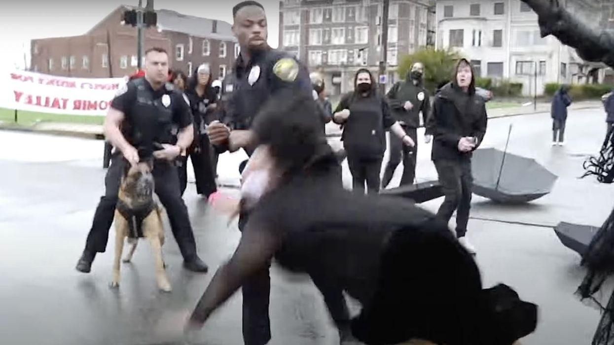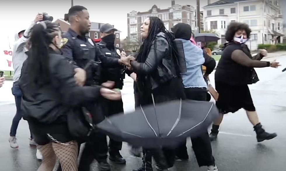 Failing to get the protesters to disperse from the intersection, the officer gets help from colleagues. As police move in and apparently try to arrest several protesters, a scuffle breaks out.
