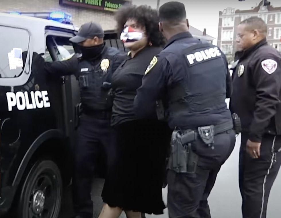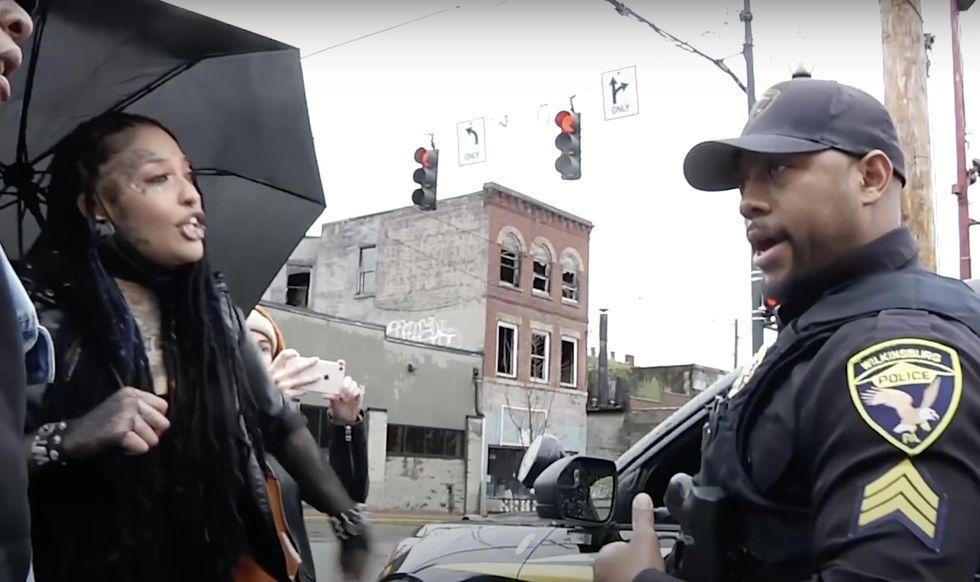 The march began in Pittsburgh and then crossed into Wilkinsburg, where video shows protesters stopping in an intersection and blocking traffic while a police officer on a loudspeaker says it's an "unlawful assembly" and that protesters "will be arrested" if they don't keep the march moving.