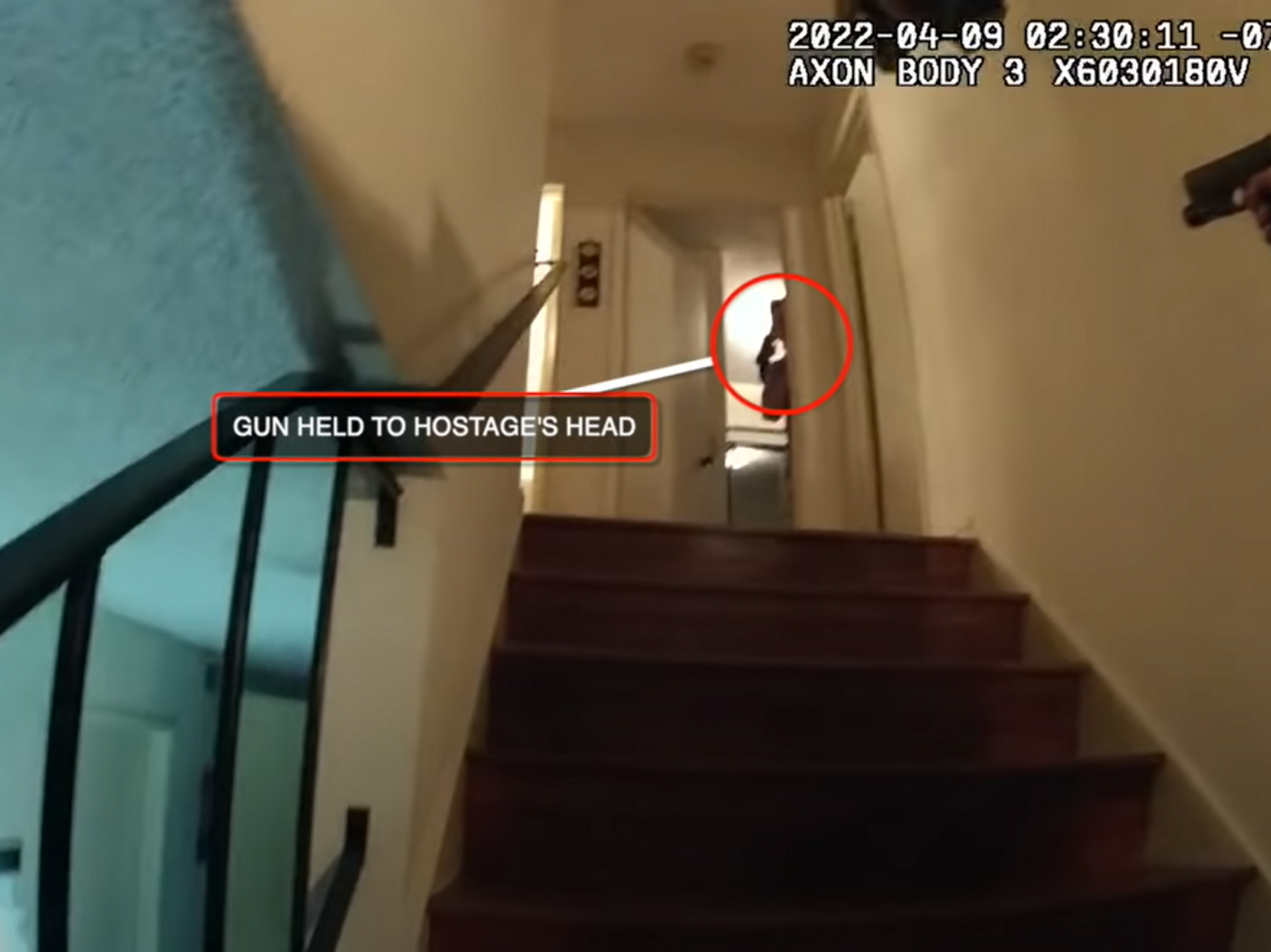 The police officer is heard telling the escaped convict, "Put it down man, please put it down."