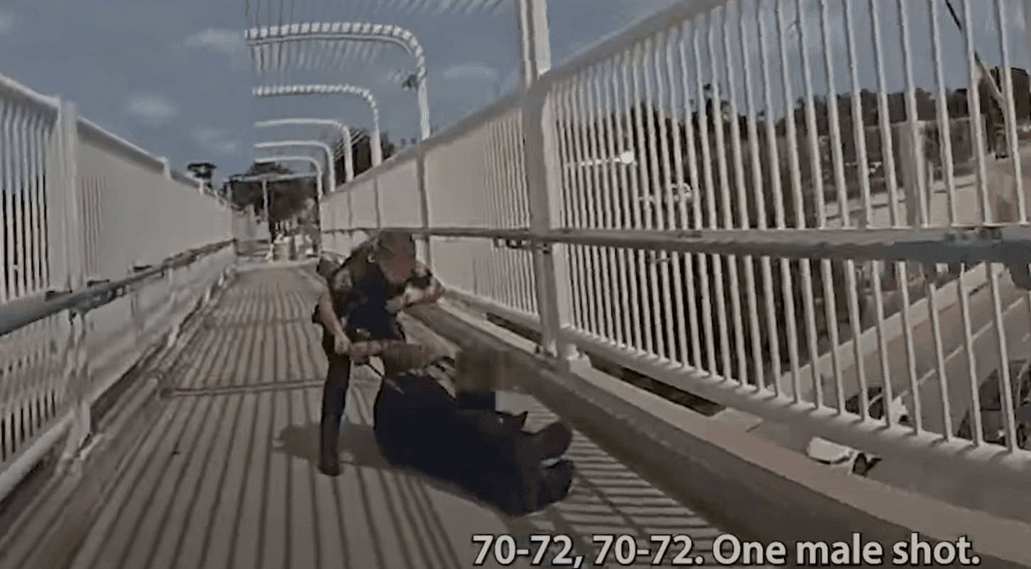 The officer who opened fire as well as other officers are seen on the bridge rendering aid to the suspect. After they roll the suspect on his back, one officer notices the suspect suffered a "gunshot in the head." By the end of the bodycam video, five officers are seen on the bridge.