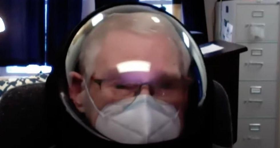 Professor Barry Mehler, age 74 — wearing space helmet-styled getup covering a face mask — was seen during a semester introduction video saying that he wouldn't kowtow to a "c**k sucker of an administrator" trying to tell him how to teach his classes.