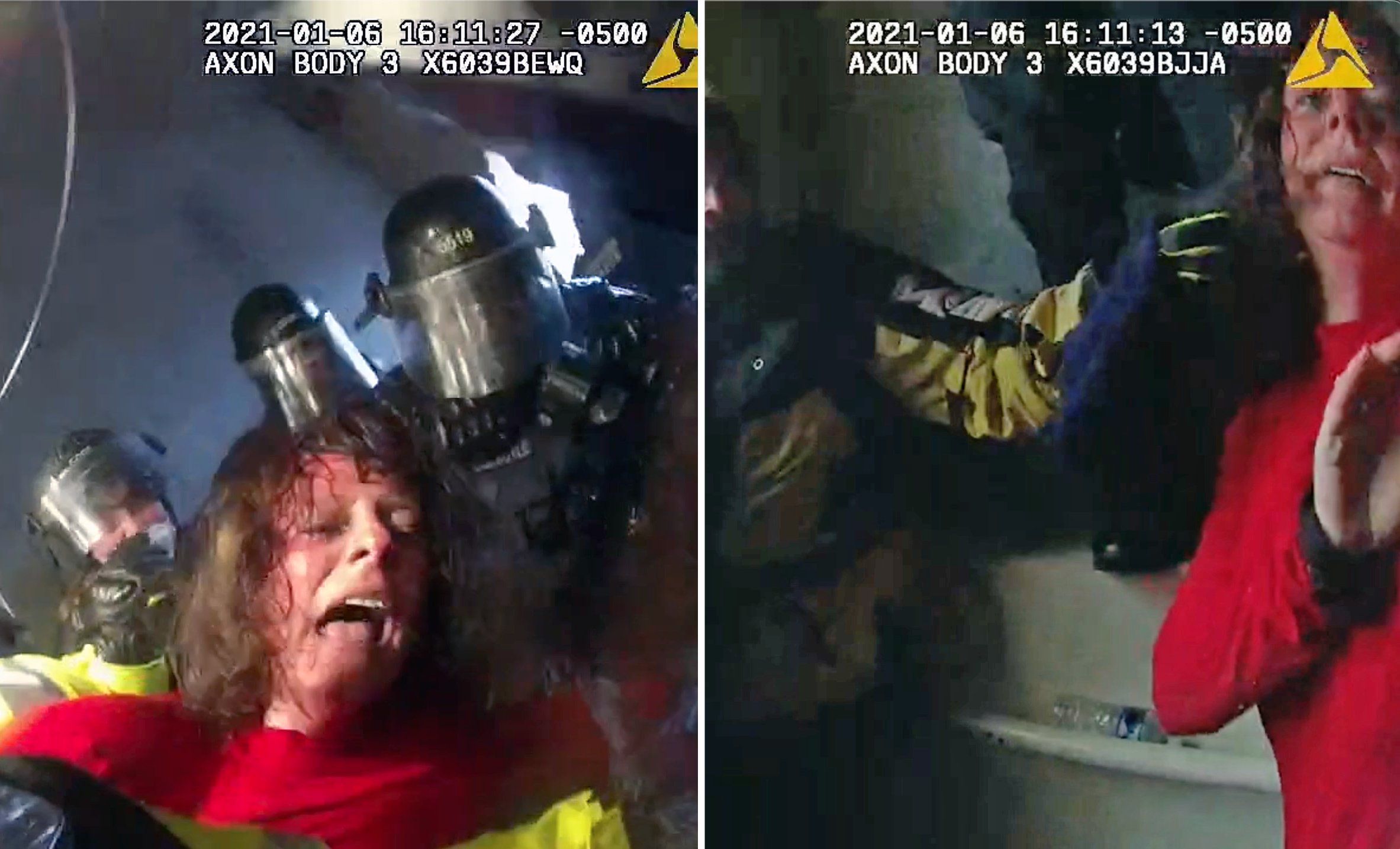 Protester Victoria White is tossed around by police during a severe beating in the Lower West Terrace Tunnel at the U.S. Capitol on Jan. 6, 2021.Bodycam Images/Metropolitan Police Department
