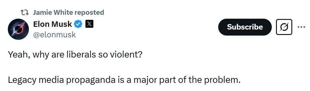 "Yeah, why are liberals so violent? Legacy media propaganda is a major part of the problem," Musk wrote.