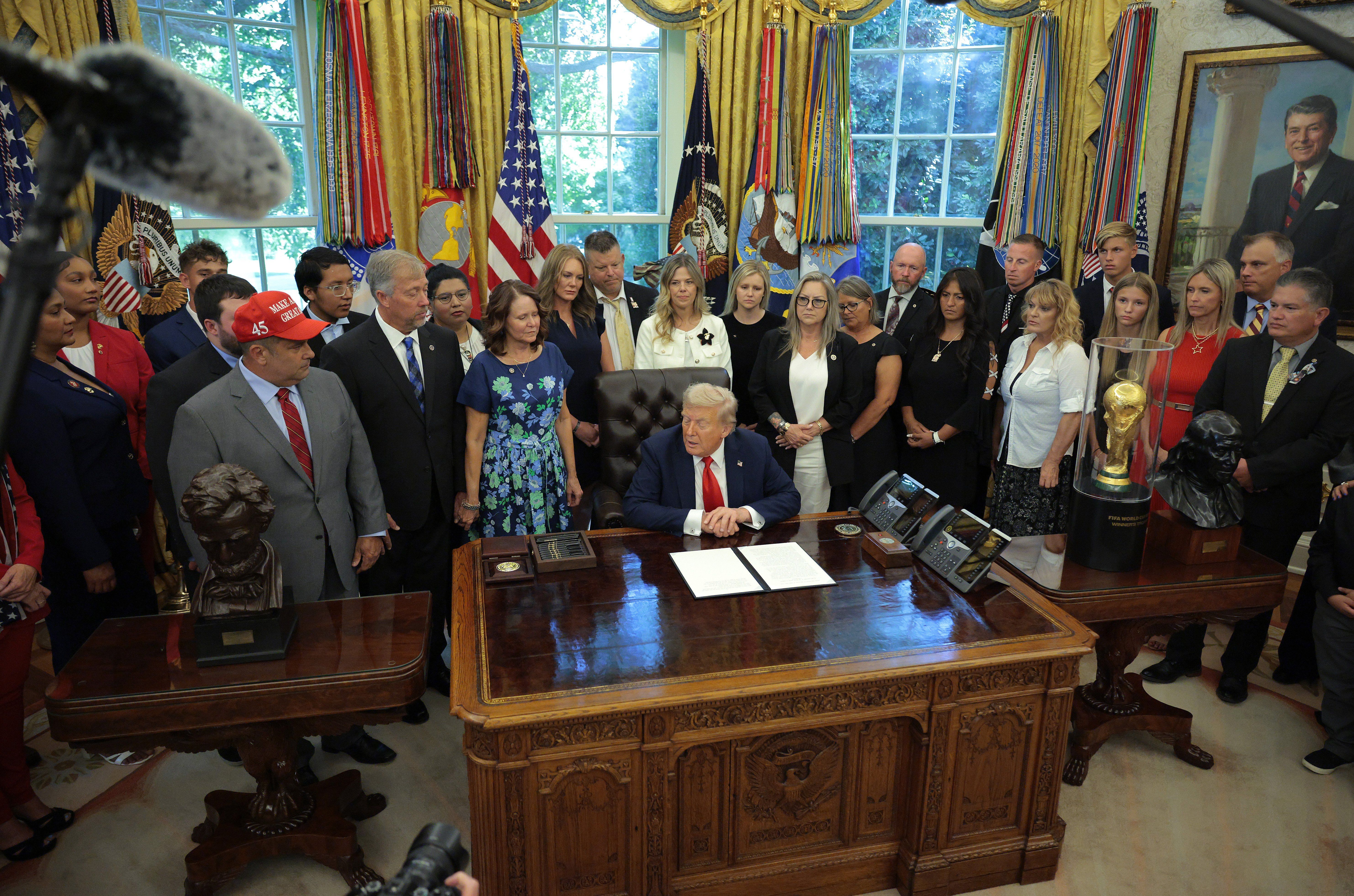 President Donald Trump honored the fallen soldiers from the Abbey Gate attack of 2021, commemorating their service and bravery alongside the Gold Star families.