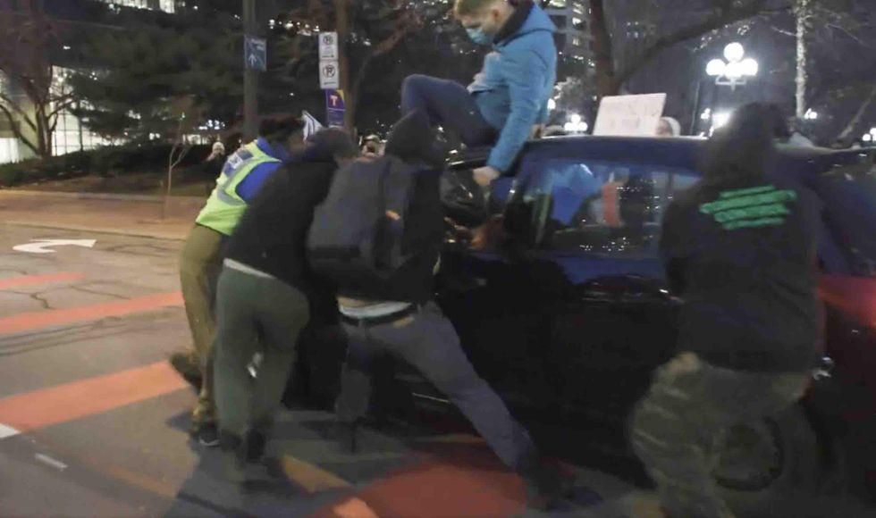 One man climbed atop the moving car as others pounded on the vehicle and appeared to try to open the driver's side door.