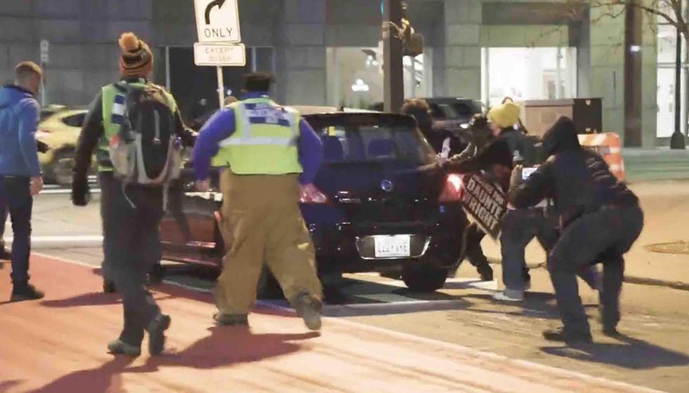 A group of enraged leftists screamed bloody murder as they climbed atop, pounded on, and chased a car whose driver navigated through a Daunte Wright protest Tuesday evening that the city of Minneapolis apparently did not sanction.