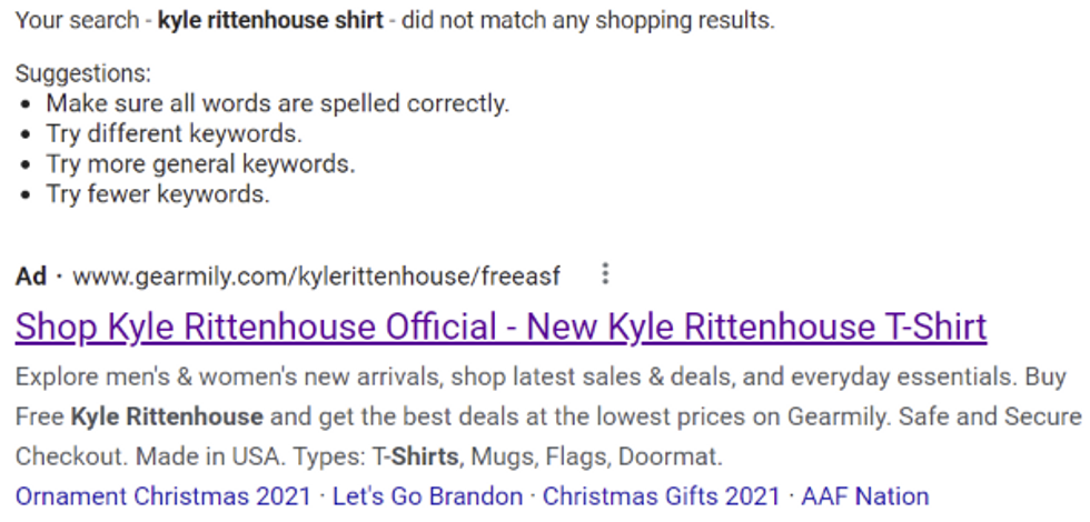 As of Sunday evening, when you do a Google search of "Kyle Rittenhouse shirt" on the tech platform's shopping tab, you receive a message that states: "Your search — Kyle Rittenhouse shirt — did not match any shopping results."