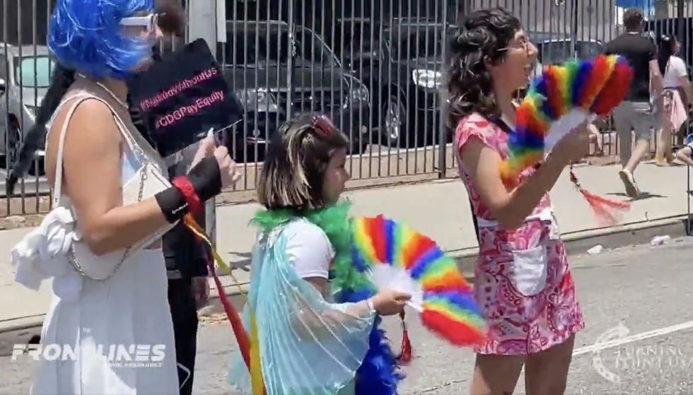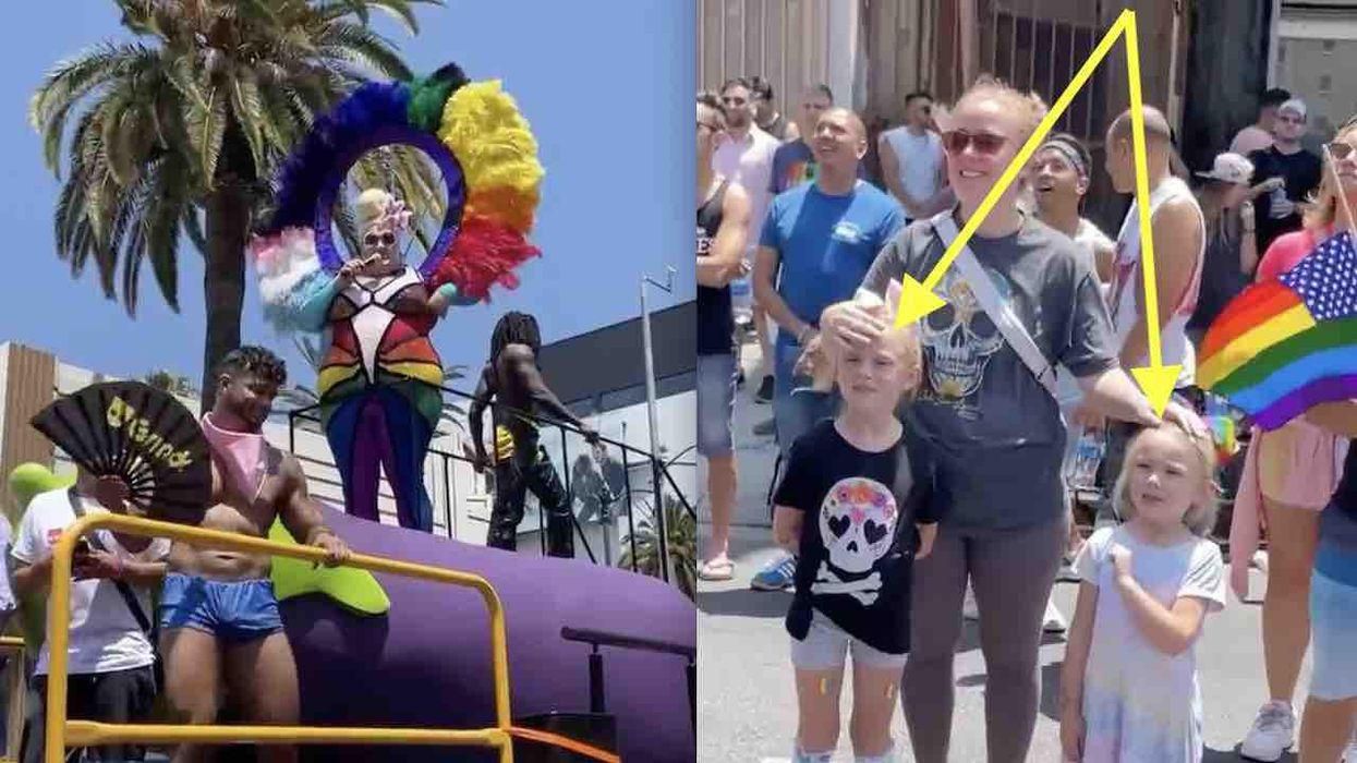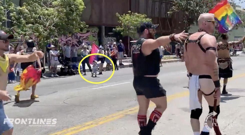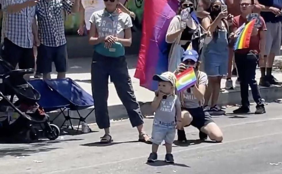 "Happy Pride! We have bandanas and lube!" the individual on a microphone said after which the video camera panned to the smiling mother and two children in the crowd: