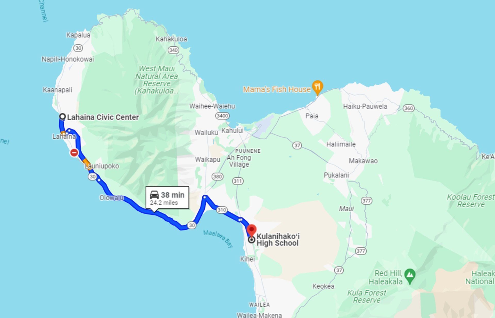 Perhaps most important is the fact that, in addition to the Upcountry fires and the fires in Lahaina, there was yet another fire on the island on August 8. At 6:10 a.m. that day, a fire was reported near a high school in Kihei, located more than 20 miles south of Lahaina.