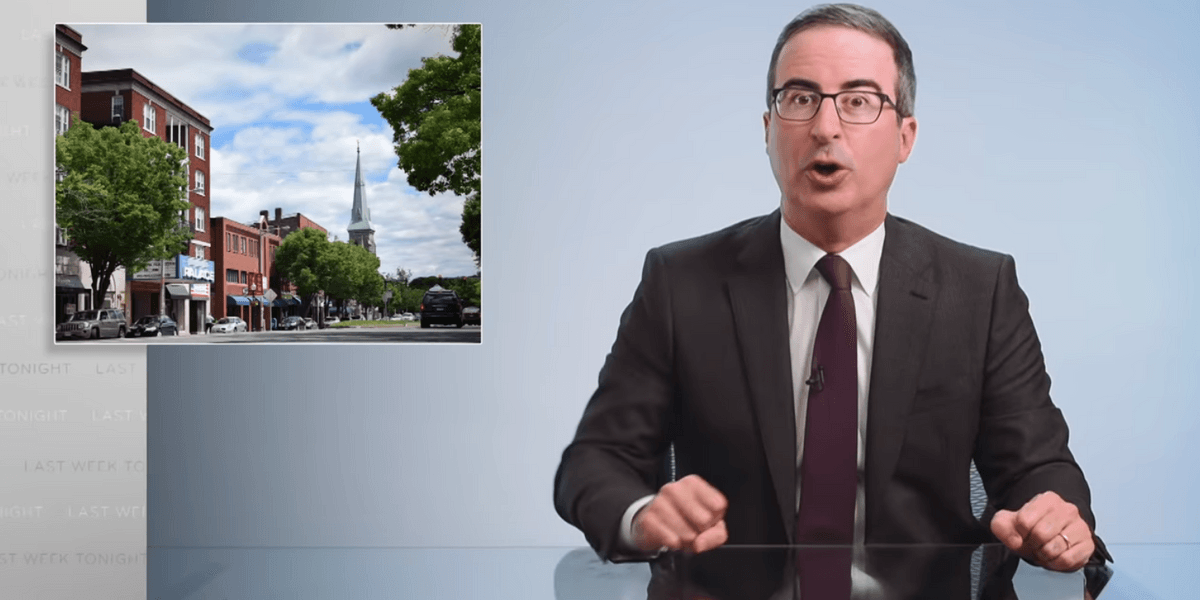 Stu Burguiere of “Stu Does America” isn’t as amused as Oliver’s audience, as he knows that what Oliver is saying isn’t funny, true, or helpful.