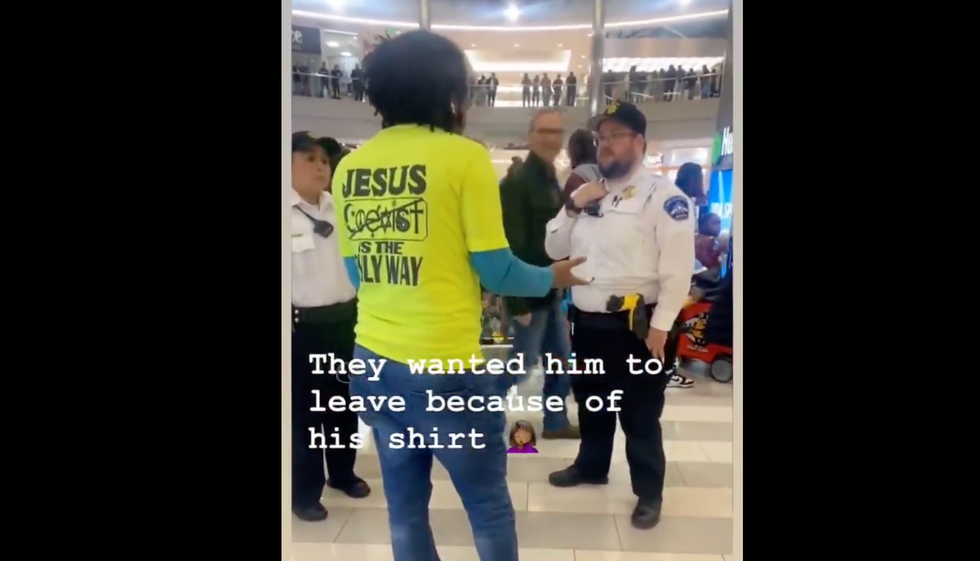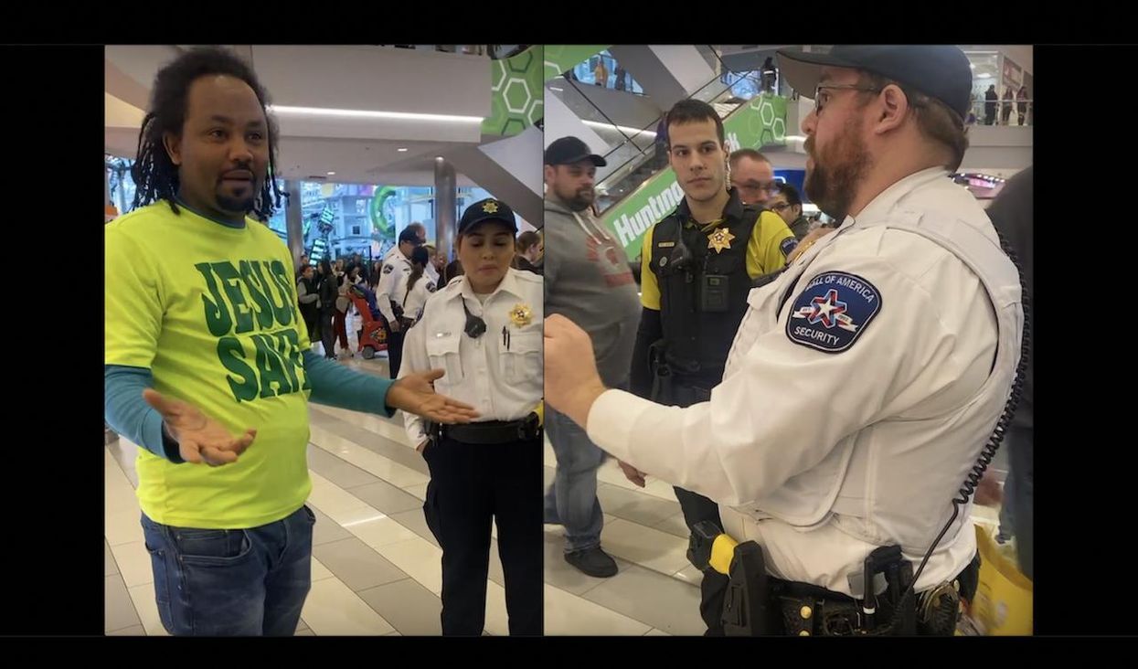 Here's another clip that ends with the man in the "Jesus saves" shirt giving a fist bump to different guard, and the man in the shirt and the guards part ways. It isn't clear if the man left the mall or not: