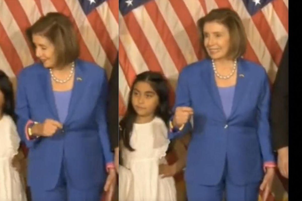Video shows Pelosi motioning with her raised right hand for a pastor to come over for a photo. She then looks down at Flores’ daughter standing next to her, and Pelosi moves her bent right forearm to the right — apparently contacting the shoulder of Flores' daughter — as the girl moves to the right at the same time.