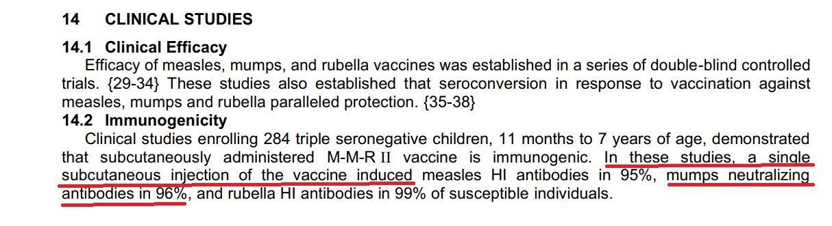 According to Merck's MMR II product insert, updated within the last year, "96%" of the children who were injected with MMR II in its "clinical studies" exhibited "neutralizing antibodies" for the mumps virus. In other words, the vaccine is 96% effective at guarding recipients against mumps infection, the company asserts.