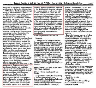 The polio immunization program "depends on" "maintaining public confidence," the register continued, so the FDA ought not to revoke the polio vaccine license based on "deficiencies in the lots" used to test the polio vaccine's efficacy.