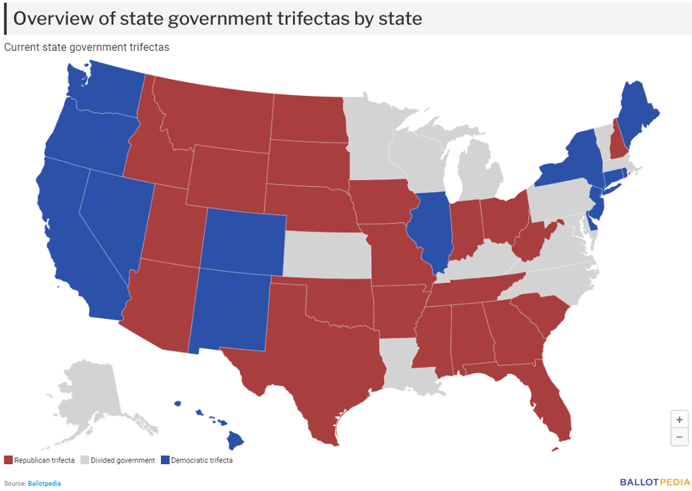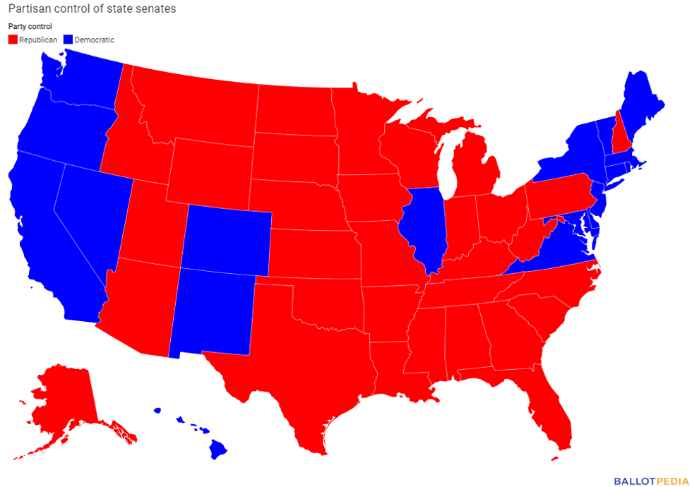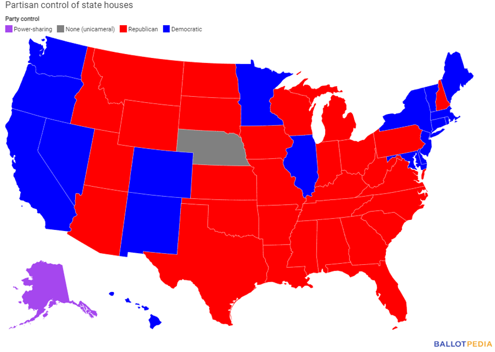 At present, Republicans hold 23 trifectas (governorship and both chambers of the legislature), Democratic hold 14, and in 13 states there is divided government. Here is the graphic presentation from Ballotpedia:
